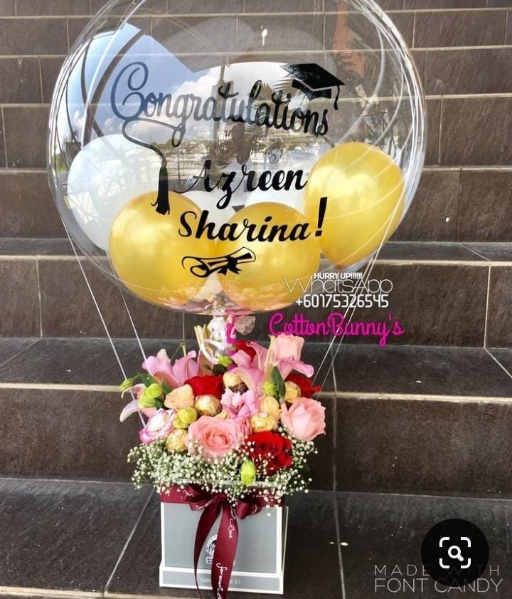 ARREGLOS CON ROSAS VARIADAS EN CAJA DE MADERA CON FERRERO GLOBO PERSONALIZADO