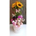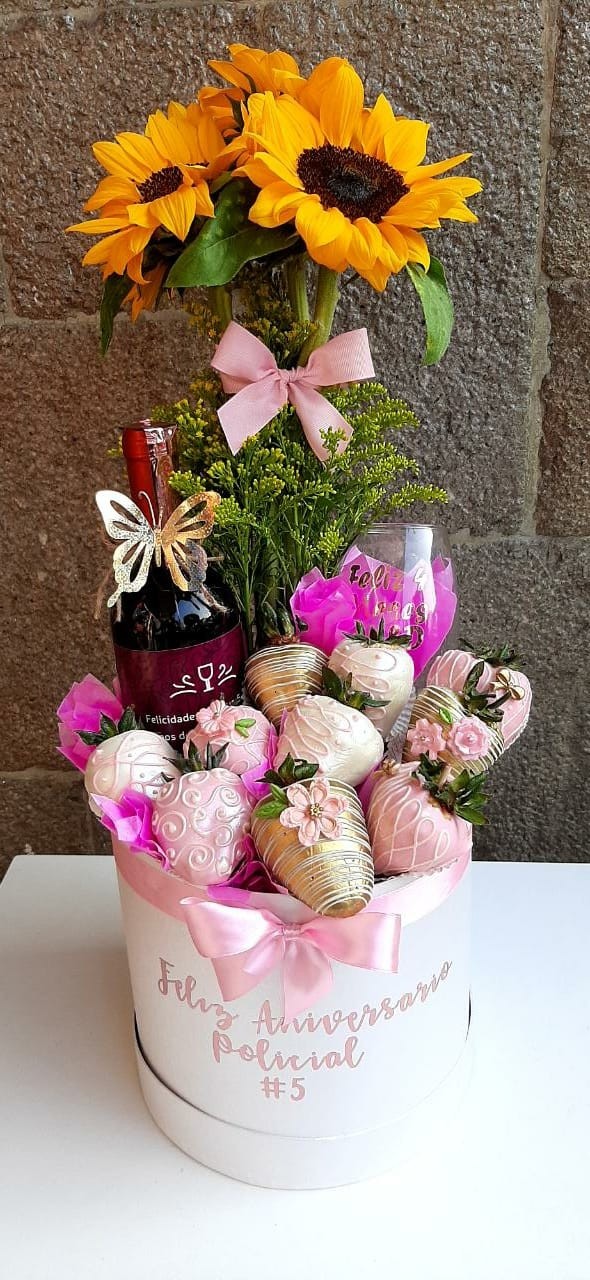 Caja con Frutillas Decoradas con una copa personalizada y botella de Vino.. acompañada de Girasoles caja podemos personalizar a su gusto