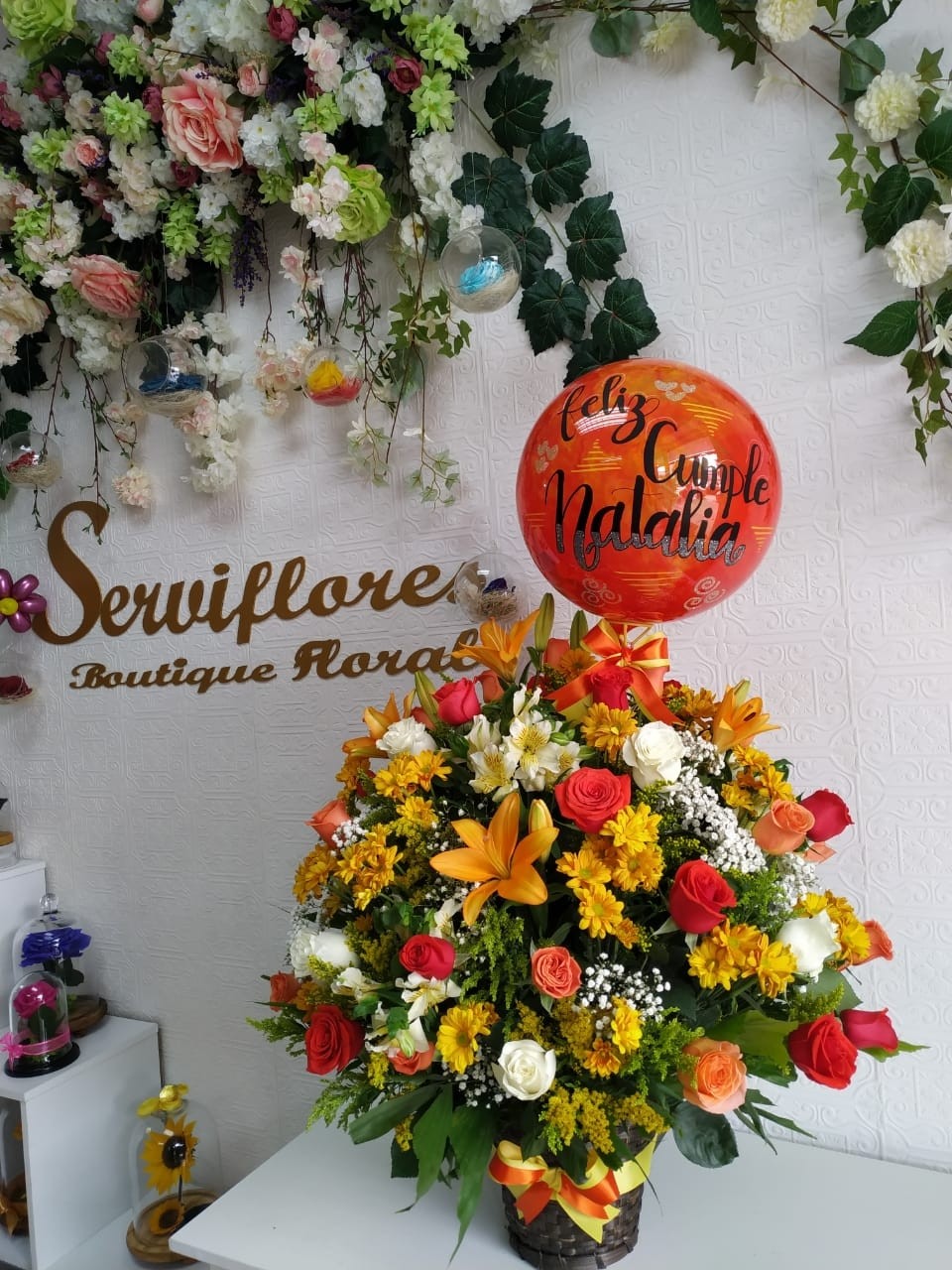 ARREGLO CON FLORES TROPICALES CON 60 ROSAS NATURALES INCLUYEN LIRIOS, MARGARITAS ROSAS MATIZADAS Y NARANAJAS EN CANASTA DE MIMBRE INCLUYE UN GLOBO PERSONALIZADO