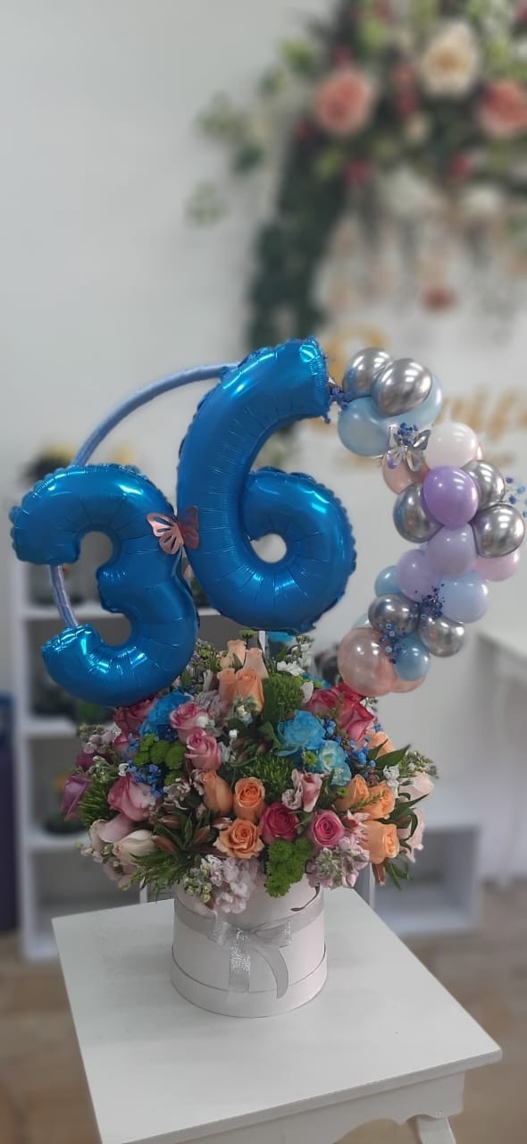 CAJA DECORADA CON DETALLES DE GLOBOS PUEDES PERSONALIZAR DE ACUERDO A LA OCASION ROSAS VARIADAS EN CAJA REDONDA