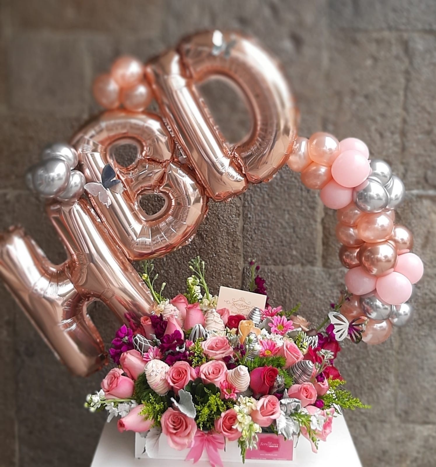 Modelos: Caja con flores variadas con frutillas achocolatadas incluye la decoracion de globos