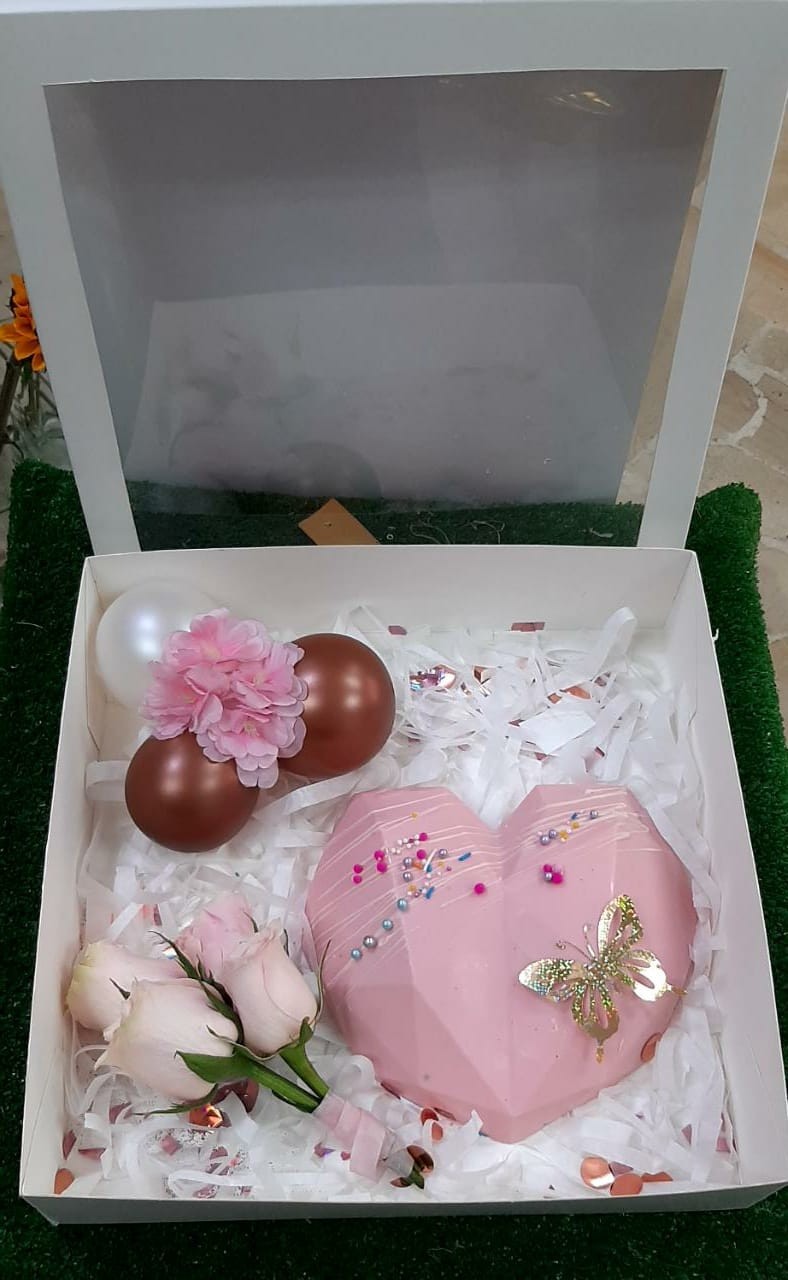 DETALLE EN CORAZON DE CHOCOLATE DECORADO A SU GUSTO (LOS TONOS A ELEJIR) INCLUYE 3 ROSAS GLOBITOS DECORADOS **DENTRO DEL CORAZON PUEDES COLOCAR LA SOPRESA QUE DESEES REGALAR