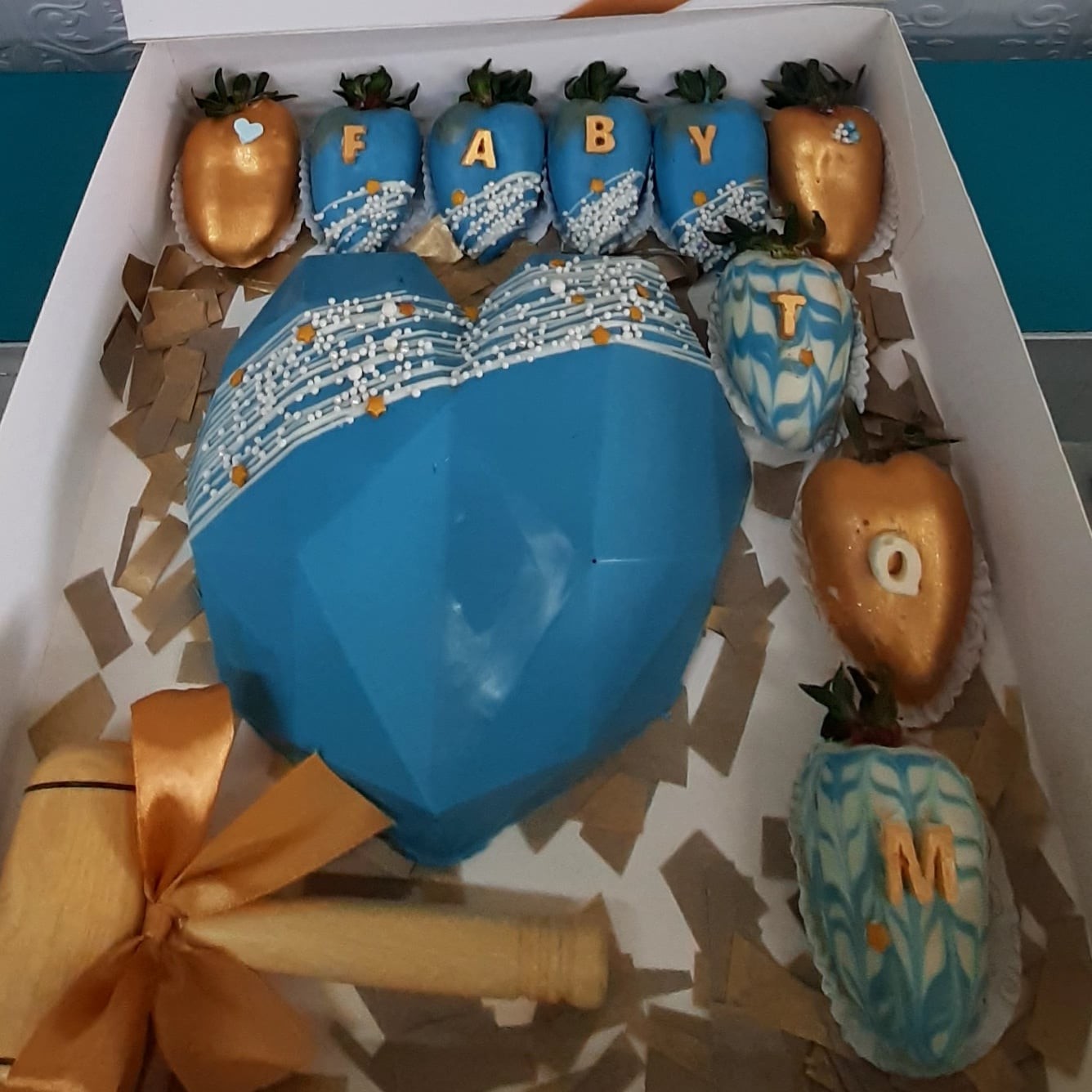 CAJA DECORADA CON FRUTILLAS ACHOCOLATADAS , CON CORAZON DIAMENTE DECORADO A SU ELECCION CON FRASES DE CHOCOLATE FINAMENTE DECORADAS