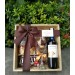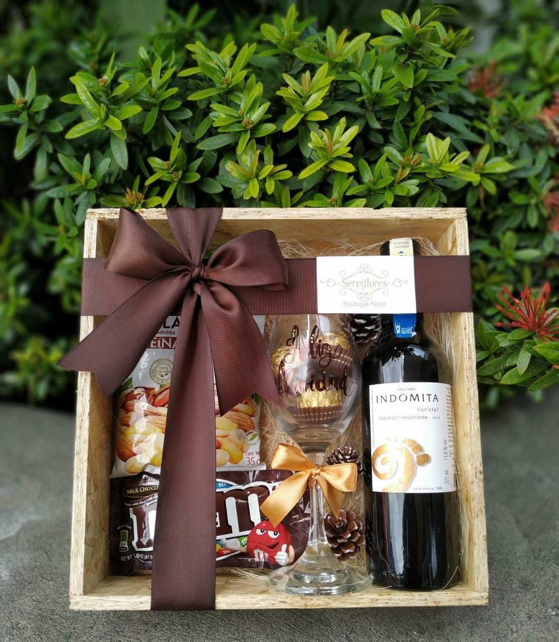 CAJA ARTESANAL CON BOTELLA DE VINO TINTO, COPA CON 3 FERRERO, CHOCOLATES M&M Y SNACK