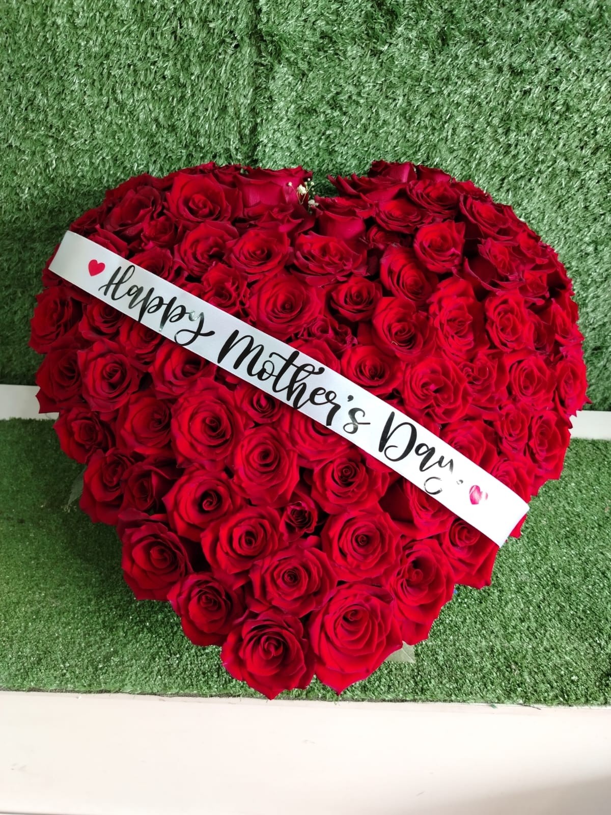 100 ROSAS ROJAS EN FORMA DE CORAZON CON CINTA DECORADA POR LA OCASION