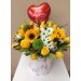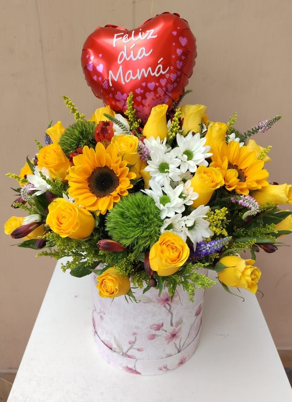 BASE DECORADA ENTONOS PASTELES, CON ROSAS VARIADAS Y GIRASOLES CON MARGARITA INCLUYE GLOBO DE MAMA