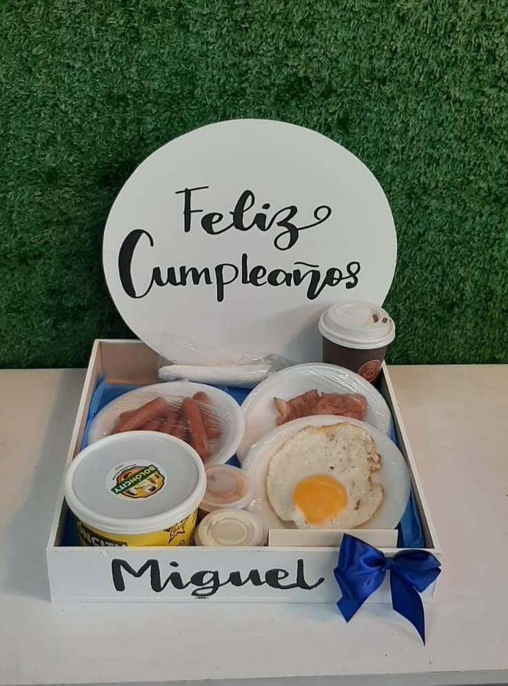 Contiene...Bandeja de madera Cartel Personalizado El nombre de la persona que recibe (o puedes personalizar a su gusto ) incluye: * huevos *Dos Tiras de Tocino *Chorizo *2 tostadas *1 Tigrillo * Moccachino PUEDES ADICIONAR A TU DESAYUNO: