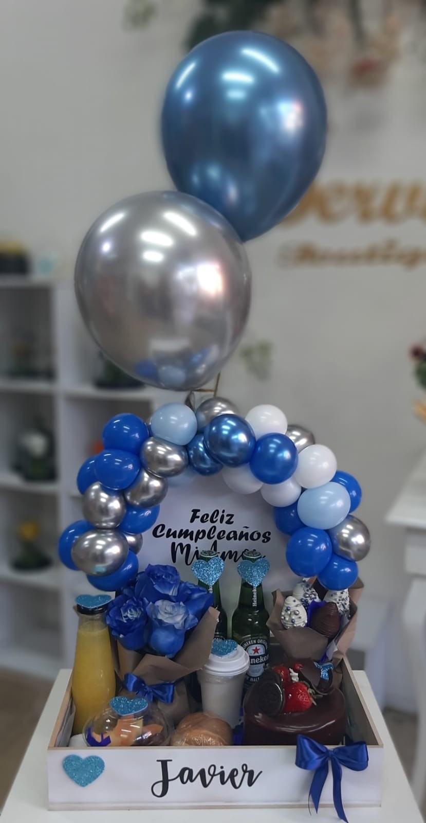 DECORACION DE GLOBOS EN BASE DE MADERA 2 CERVEZAS 1 JUGO NATURAL FLORES MOCCACINO PORCION DE FRUTAS MINI TORTA FRUTILLAS ACHOCOLATADAS PAN DE SAL