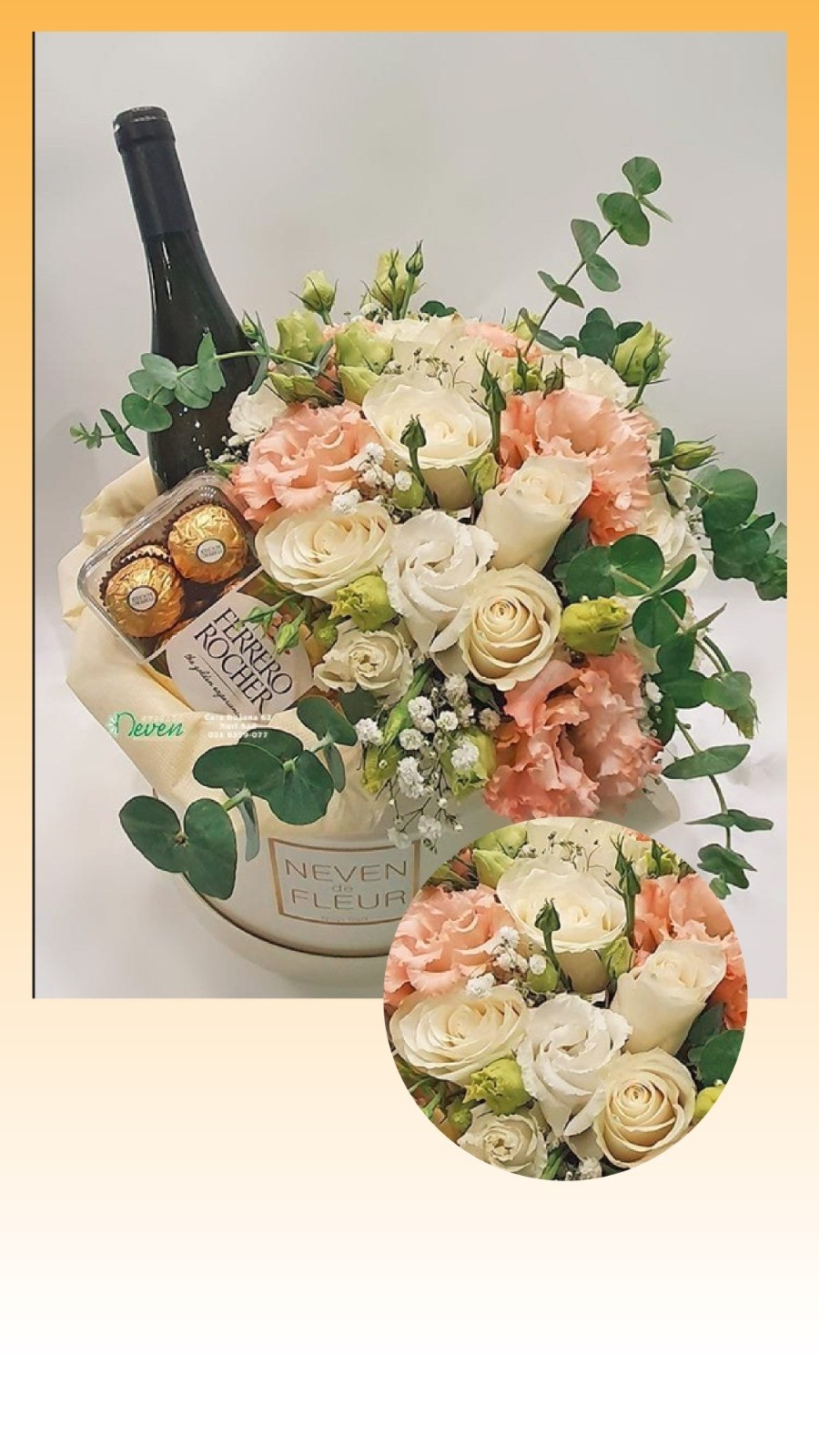 CAJA BLANCAS CON BOTELLA DE CHAMPANG CON CAJA PEQUEÑA DE CHOCOLATES ACOMPAÑADO DE ROSAS BLANCAS Y MELON