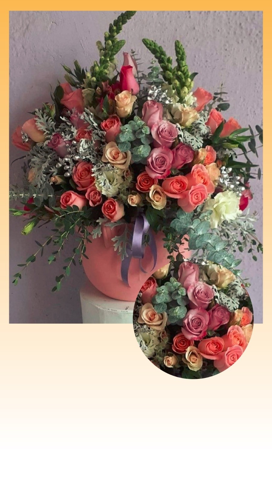 CAJA REDONDA PUEDE VARIAR EL TONO ARREGLO DE ROSAS TROPICALES CON VARIAS FLORES DE ESTACION