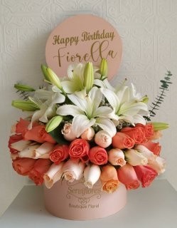 CAJA DECORADA Y PERSONALIZADA DE 36 ROSAS VARIADAS CON LIRIOS (PUEDE VARIAR DE ACUERDO AL STOCK)