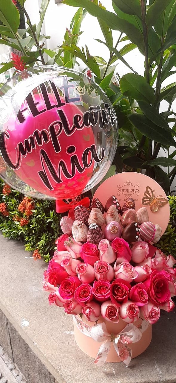CAJA DECORADAD CON 12 FRUTILLAS ACHOCOLATADA 36 ROSAS VARIADAS Y GLOBO PERSONALIZADO DE ACUERDO A LA OCASION