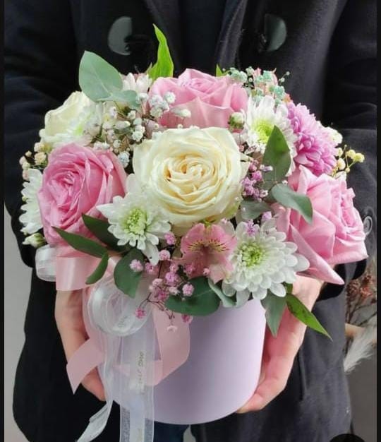 DETALLE EN CAJA MEDIANA CON ROSAS ROSADAS Y ROSAS BLANCAS